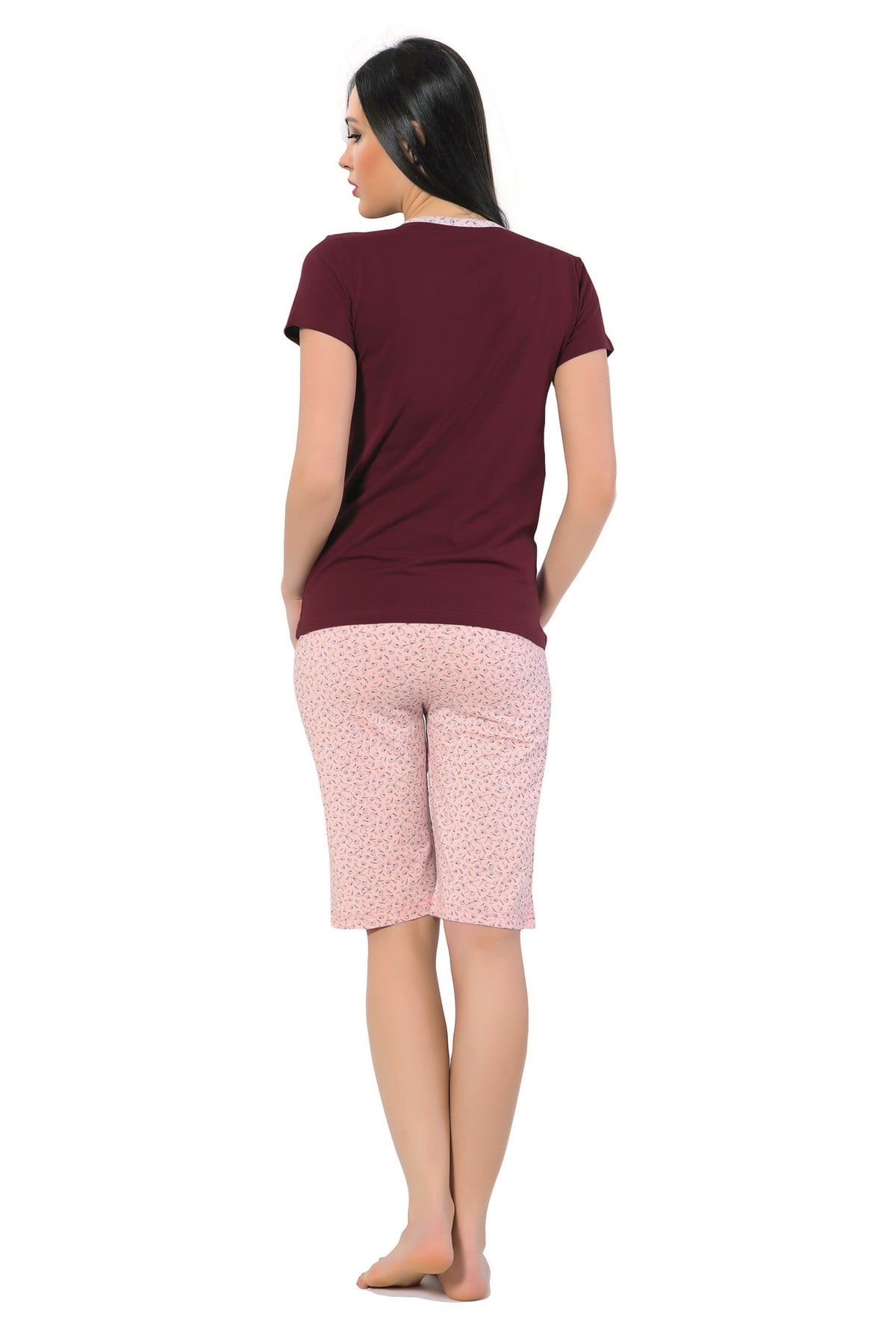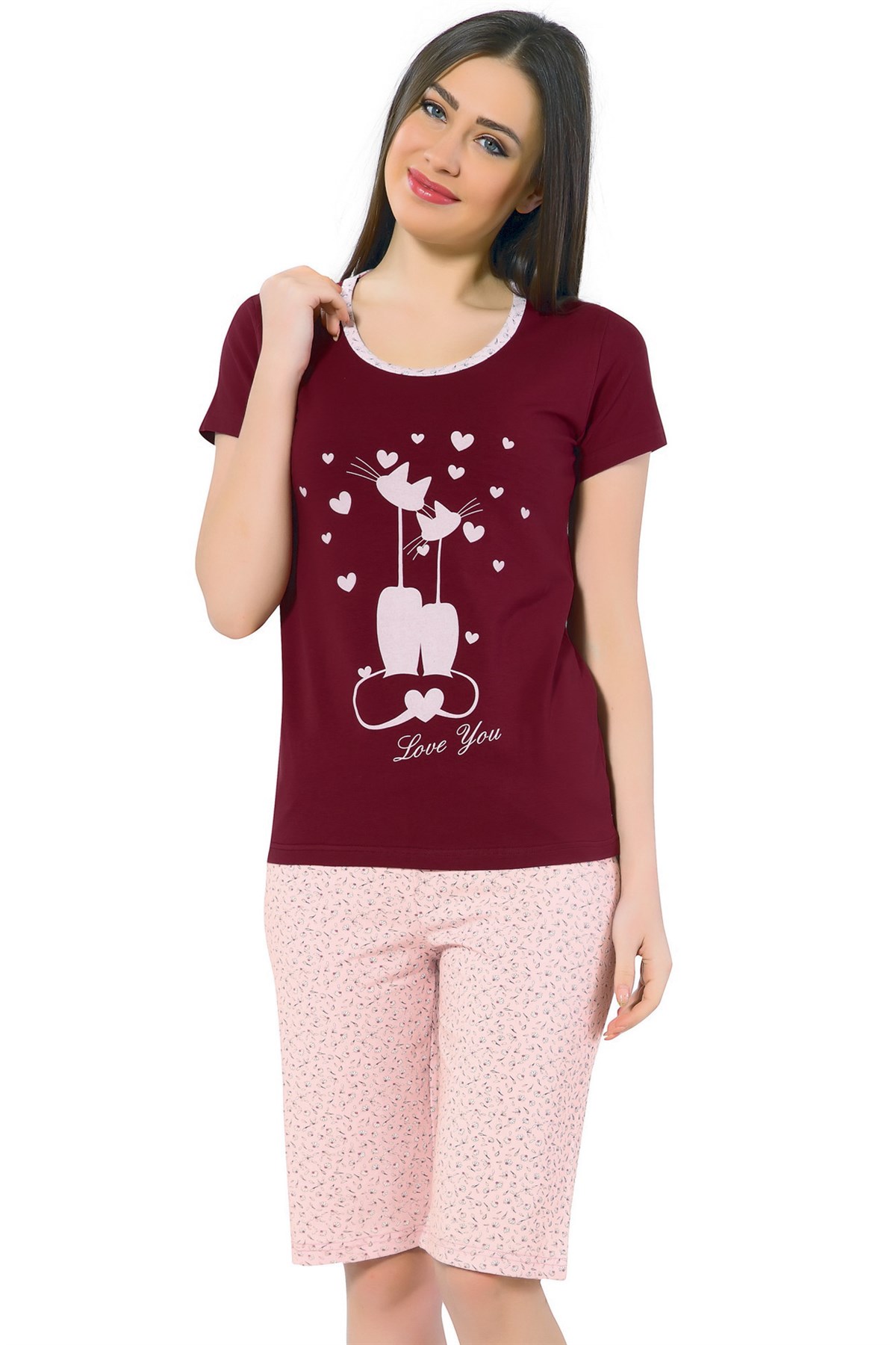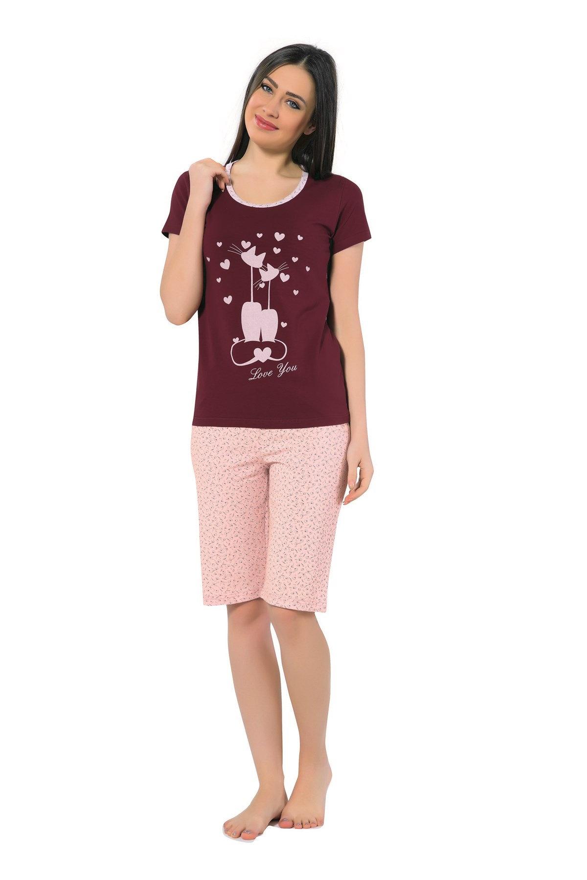 Akbeniz Kadın Kedi Desenli Bordo Kapri Pijama Takımı 3137